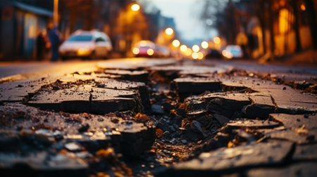 Sunlit Urban Street at Dusk with Cracks in Asphalt and Vehicles Capturing a Moment of Transition between Day and Night in an Urban Environment