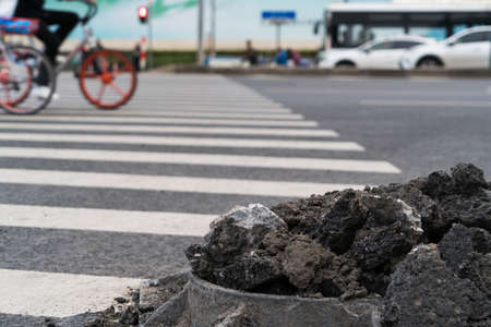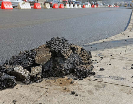 Pieces of fresh asphalt on sidewalk near repaired carriageway. Image can be used as background.