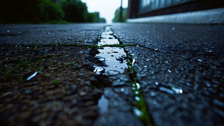 A crack in the road is shown on a rainy day, AI