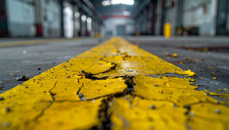 A low-angle perspective follows a cracked and peeling yellow line across a gritty concrete floor.