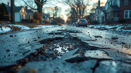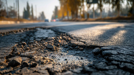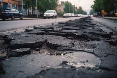 Damaged City Street: Close-Up of Potholes in Asphalt Pavement. Generative ai. High quality illustration