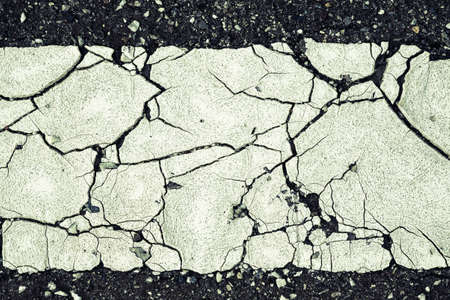 Old damaged cracked asphalt road section with old paint road marking. texture damage. Deterioration of the road surface. copy space