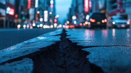 A nighttime urban street scene featuring a prominent crack in the pavement, highlighting the aftermath of an earthquake with blurred city lights and vehicles.