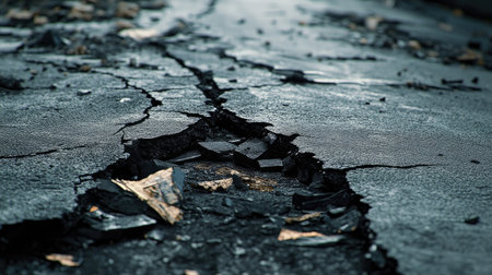 A close-up view of a cracked asphalt surface showing significant damage. This image illustrates the effects of weather and neglect on urban infrastructure.
