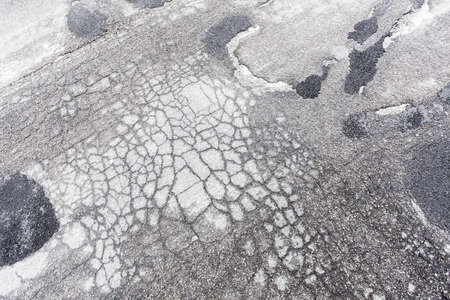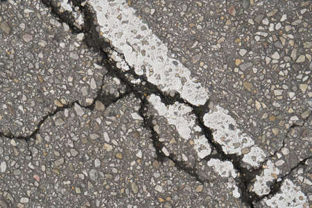 Broken asphalt and cracks on the road surface