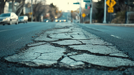 Close-up view of cracked and damaged asphalt on an urban road, highlighting the wear and tear caused by weather and traffic. The scene captures the need for repair and maintenance.