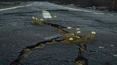 A damaged asphalt road with a crack filled with patches of moss and small flowers growing in the fissures