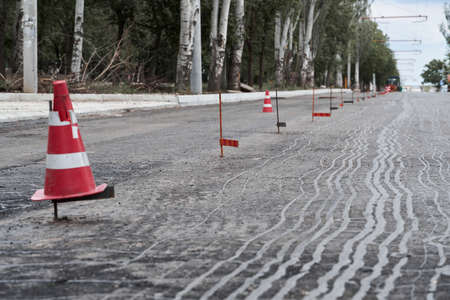 road construction or repair - laying a new layer of asphalt, marking the level for increased accuracy and warning signs cone