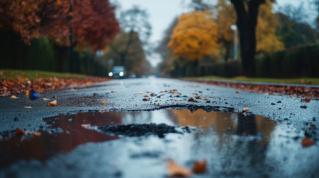 A stunning image showcases a pothole on a rainy street during autumn, where colorful leaves reflect on the wet asphalt, evoking a serene and contemplative urban atmosphere.