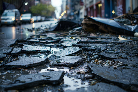 Destroyed road with cracks, rubble, and asphalt chunks forming an intense debris background.