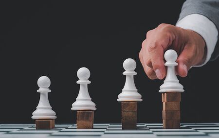 Closeup of businessman moving pawn chess figure. Leadership concept.