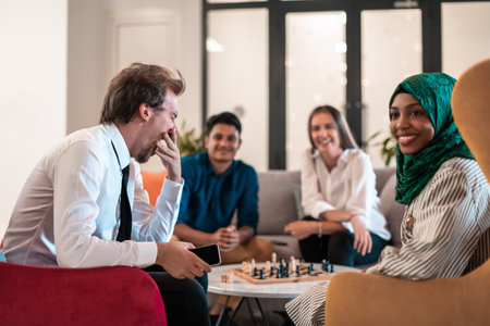 Multiethnic group of business people playing chess while having a break in relaxation area at modern startup office.