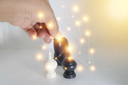 Human hand holding chess pieces. The concept of business strategy, strategic planning