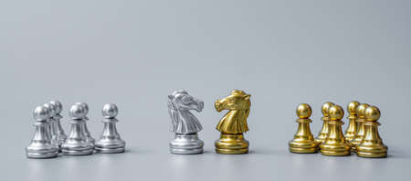 Gold and silver Chess Knight (horse) figure on Chessboard against opponent or enemy. Strategy, Conflict, management, business planning, tactic, politic, communication and leader concept