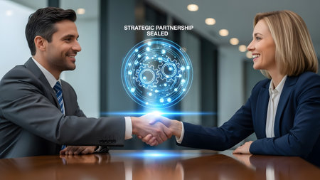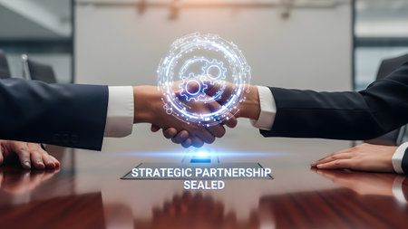 Two business professionals shake hands, a digital graphic of gears signifies partnership.