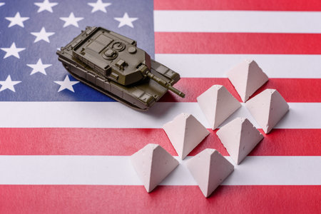 A miniature of a military tank with arrows pointing in different directions. military strategy