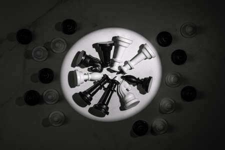 Chess pieces on a stone table. cinematic light. Intellectual game background.