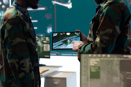 Team of diverse troopers examining satellite CCTV footage on a tablet, collecting information for a reconnaissance mission in command center. Soldiers engineers operating high tech gear.