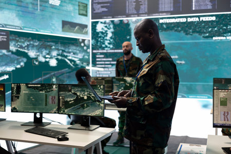 Infantry unit soldier analyzing satellite CCTV imagery to collect data crucial for a field mission, works in army command post. Operating high tech reconnaissance gear and a big screen.