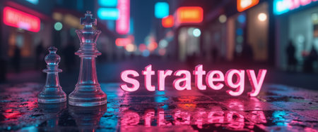 A glowing neon chess piece standing in front of a strategy sign, symbolizing planning and decision-making in a modern context.