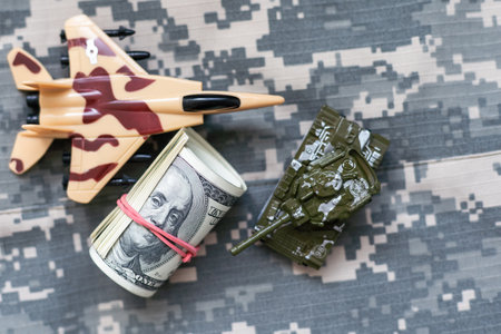 Miniature people standing on miniature military army vehicle tank with copy space for your text or design.