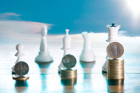 Figures of chess and a stack of coins on a chessboard. The concept of financial growth, success and victories. Strategic investment with money.
