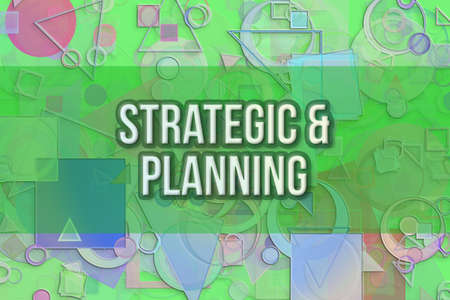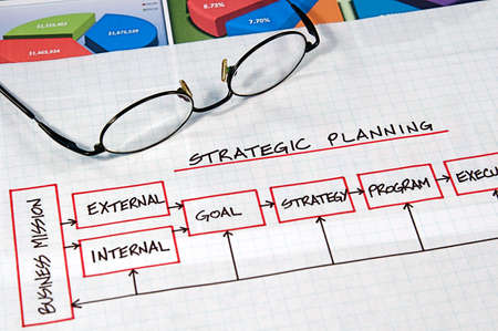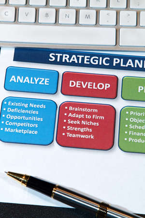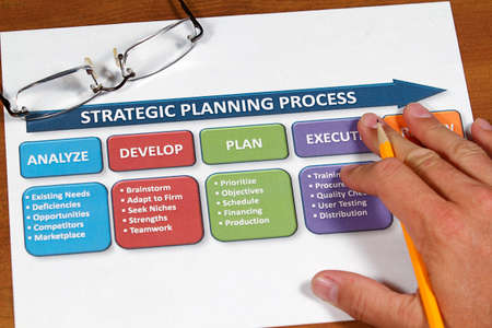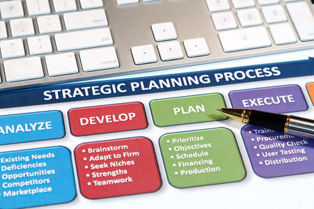 Strategic Planning Process text with keywords isolated on white board background. Chart or mechanism concept.