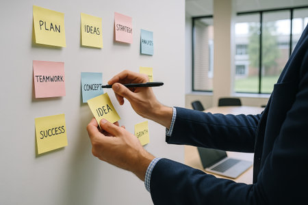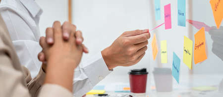 Business professional organizing sticky notes with ideas, concept, and strategies on office wall. concept of project planning, teamwork, brainstorming session.
