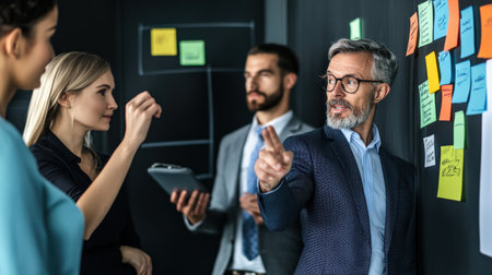 Business people arranging sticky notes commenting and brainstorming on work priorities colleague in a modern co-working space