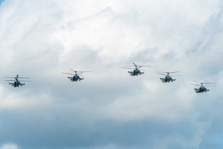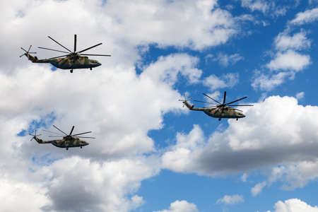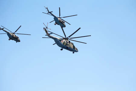 Moscow, Russia - May 7, 2021: Flying helicopters at rehearsal for The Victory Day military parade on May 9.