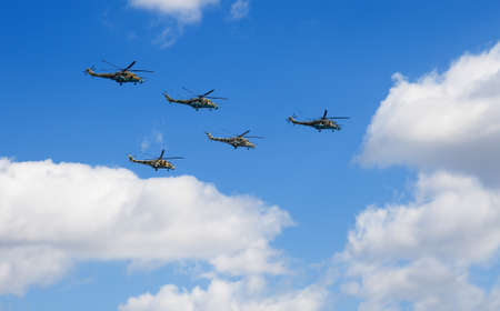 MOSCOW, RUSSIA - June 24,2020. An air parade of military combat helicopters of Russian Air Force fly in skies of Moscow over Kremlin and Red Square in 75th anniversary of Victory during Victory Parade