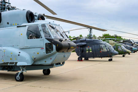 Military helicopters in row standing on runway, air force ready to attack, modern army aviation and aerospace industry