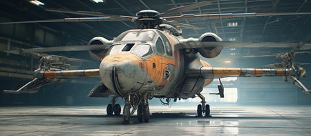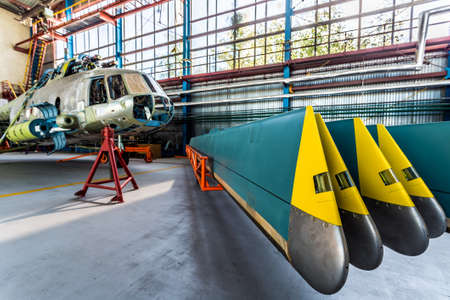 Helicopter rotor blades removed from aircraft. Air transport stand in the aviation hangar.