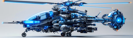 This image showcases a meticulously crafted, futuristic helicopter with complex mechanical details. It's depicted flying high above a layer of clouds, its rotor blades spinning creating an advanced and visually striking scene.