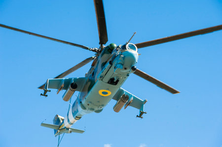 Russian Air Force Mi-28 Havoc attack helicopter climbing out of the Kubinka airbase to training flight for the Great Victory Day military parade