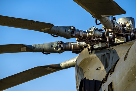 Powerful propeller and blades of a military helicopter against the background of a bright blue sky