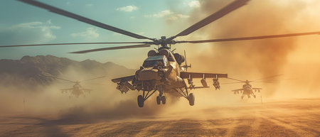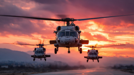 Helicopters take off from a runway at a military base, silhouetted against a vibrant sunset sky. The scene captures the power and precision of aviation in a dramatic backdrop.