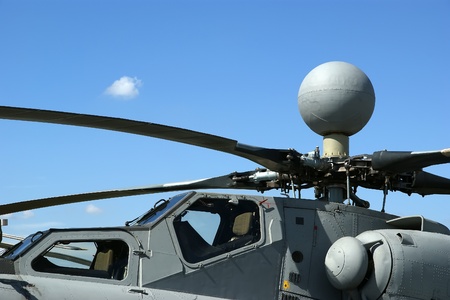 Detail of Helicopter Engineering on a beautiful blue sky,Military Helicopter fighter cockpit.