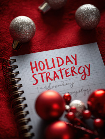 A notebook titled Holiday Stratergy sits on a rich red surface, surrounded by sparkling ornaments, reflecting the spirit of festive planning and organization.