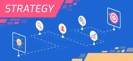 This color illustration shows the symbols of the strategy idea, solution search, tactics, a growth of graphs, mechanism, technology and goal achievement