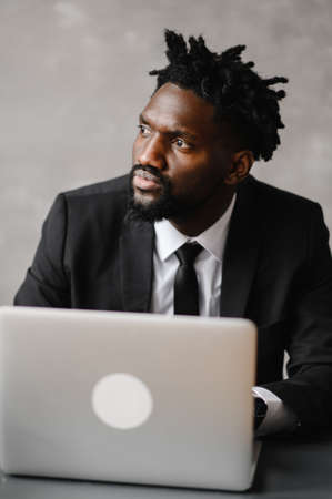 Thinking attractive adult successful bald bearded man in suit with laptop in cafe