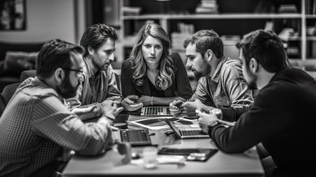 Group of young business people working together in modern office. Black and white.