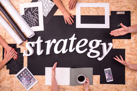 Strategy, business motivational inspirational finance quotes, wooden words typography lettering concept