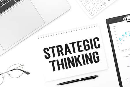 Text STRATEGIC THINKING on notebok. Laptop, pen, glasses, calculator and clipboard. Business concept. Flat lay.
