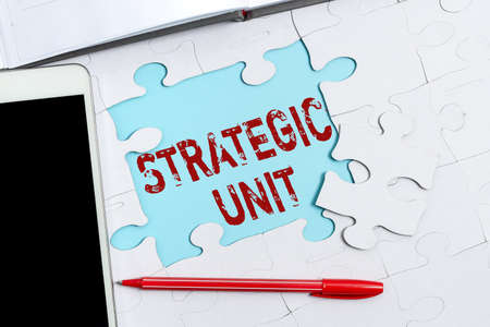 Hand writing sign Strategic Unit. Concept meaning profit center focused on product offering and market segment. Building An Unfinished White Jigsaw Pattern Puzzle With Missing Last Piece