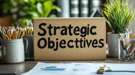 This image showcases a decorative sign reading Strategic Objectives set on an office desk, surrounded by stationery and plants, ideal for business themes or planning presentations.