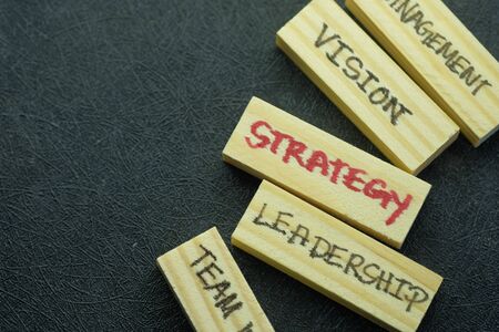 Strategy word written on cube shape wooden blocks on wooden table.
