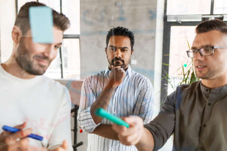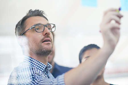 Business people arranging sticky notes commenting and brainstorming on work priorities colleague in a modern co-working space
