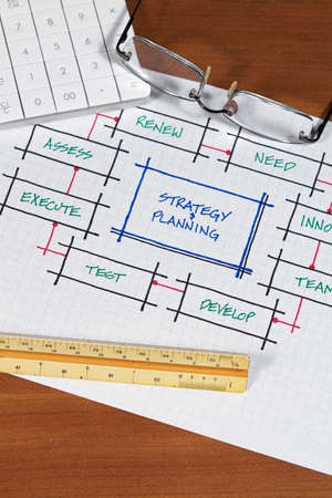 Strategic Planning Process text with keywords isolated on white board background. Chart or mechanism concept.