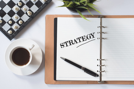 chess set,coffee,green plant and notebook with STRATEGY word on white flat lay. business strategy concept